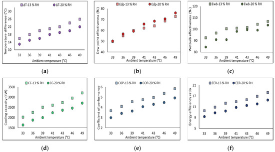 In this study, the results were obtained using the ACLU by creating different temperature and humidity conditions. With this system, the temperature difference of the processed air through dry channels increases by increasing the ambient air temperature (Ta) at fixed velocity (V) and water temperature (Tw) values. The evaporation of the air increased by increasing the ambient temperature of the air, which contains more moisture before achieving the saturation point. The processed air holds more water vapor as the ambient temperature is increased. Therefore, the temperature difference and other parameters are also increased. The temperature difference (ΔT) varied from 12.95 to 26.04 °C, as shown in Figure 3a. The dew point and wet bulb effectiveness values were higher values at higher processed air temperatures as compared to lowered process air temperatures. The dew point effectiveness values varied from 0.5 to 0.75, as shown in Figure 3b. The wet bulb effectiveness varied from 0.84 to 1.07, as shown in Figure 3c. The maximum CC, COP, and EER values were measured with optimal input parameters, i.e., Ta = 49 °C, Vin = 6.1 m/s, RH = 13 %, and Tw = 25 °C. The cooling capacity (CC) increases when the inlet temperature is increased and decreased or when RH is increased. Here, the CC values were between 3215 and 1612 W, as shown in Figure 3d. It can be observed that increasing the CC results in higher COP and EER values. The COP and EER values varied from 2.93 to 5.85 and from 9.21 to 18.37, as shown in Figure 3e,f, respectively.