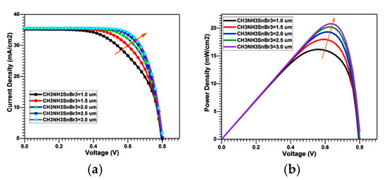 A photovoltaic cell’s principal function is to convert light energy into electrical energy. A PV cell is a large flat diode that creates an exponential J–V curve in dark. A PV device produces a very low current value due to minority carriers in the dark. The solar cell starts to work when it is exposed to light, causing generation of charge carriers. Figure 1b is representing the J–V curve of our proposed solar cell under dark and suns both conditions. The simulation was run without any variation; an initial J–V curve that we plotted is represented in Figure 1c. We obtained an open circuit voltage () of 0.797 V, and a short circuit current density () of 35.5 mA/cm2 was recorded. In the case of fill factor and efficiency, they were 68.24% and 19.34%, respectively. To observe the effect of thickness of perovskite absorber layer on the performance of the solar cell, the thickness was varied from 1.0 μm to 3.0 μm. By increasing the thickness from 1.0 μm to 3.0 μm, we observe that the J–V characteristics curve moves away from the origin as represented in Figure 2a. The effect of thickness on the P–V characteristics curves is also clear in Figure 2b. From this figure, we note that, by increasing the thickness of the absorber layer, the power density of a cell improves, because by increasing a thickness of absorber layer, the chance of photons capturing increases; hence, more sun power is converted into electrical power density. At 1.0 μm thickness of CH3NH3SnBr3, was 0.79 V, and was 35.2 mA/cm2, and the fill factor of 57.45% and eta was recorded up to 16.17%, but when the thickness was increased from 1.0 μm to 1.5 μm, the characteristics parameters were changed to 0.795 V, 35.43 mA/cm2, 63.79%, and 17.98%, respectively. Here, we observe that there is a major improvement in the efficiency, increasing by approximately 2% by increasing the thickness from 1.0 to 1.5 μm.