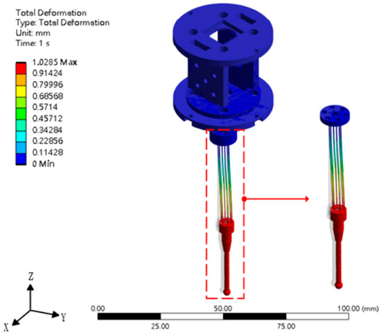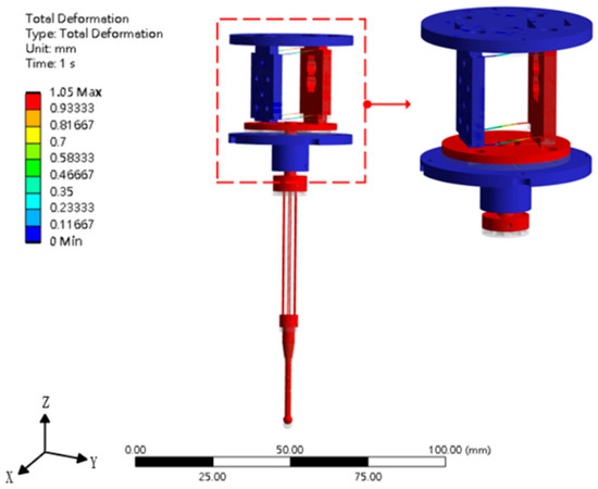 To ensure the probe meets both design and measurement requirements—including deformation rate and yield stress of the pivot spring—the analysis defined a ±1 mm measuring range for the X-, Y-, and Z-axes. A force corresponding to a 1 mm displacement of the probe tip was applied in each axis direction. The resulting data were extracted to verify whether the design criteria were satisfied. Simulation results are shown in Figure 3, Figure 4 and Figure 5, with data summarized in Table 2. The table shows that the maximum stresses on the leaf springs and steel tubes are lower than the material yield strengths, thus avoiding plastic deformation under normal use. Additionally, the pivot spring’s deformation rate is lower than that of typical commercial 3D scanning probes, which reduces deformation of the measured workpiece during contact.