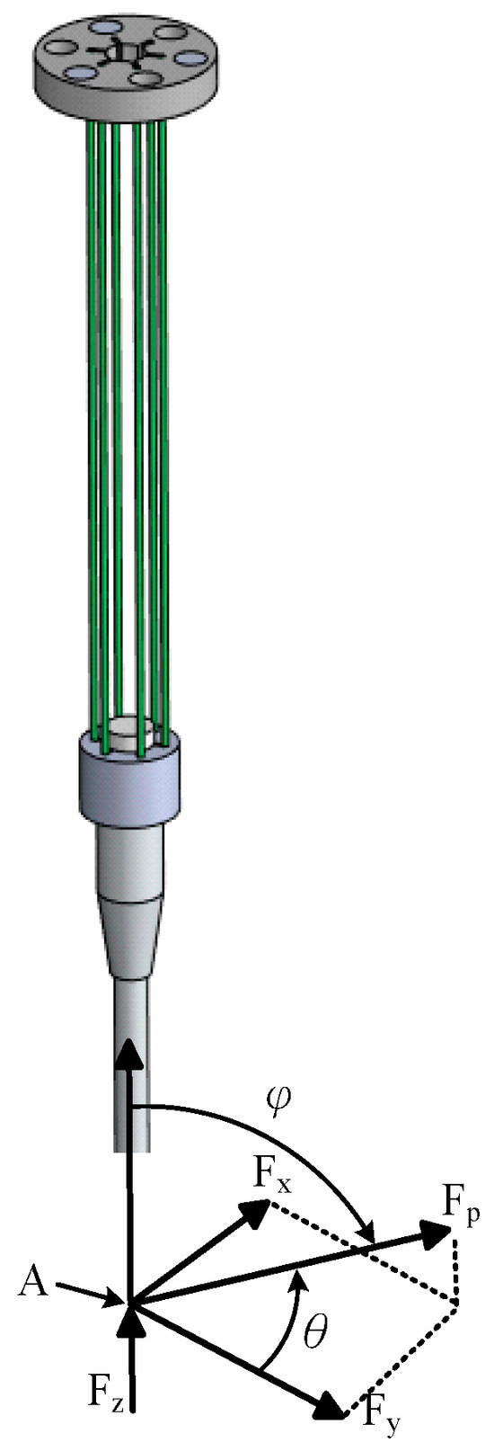 The structure of the XY-axis modular stylus (Figure 1) experiences deformation under the force applied at the probe tip, similar to a cantilever beam. This force induces angular bending in the XY-plane. To ensure uniform deformation in all directions, the six circular tubes must be evenly spaced and designed according to stiffness criteria. Excessive structural rigidity may cause initial elastic deformation followed by angular bending of the overall probe structure, which can lead to large displacements and measurement errors.