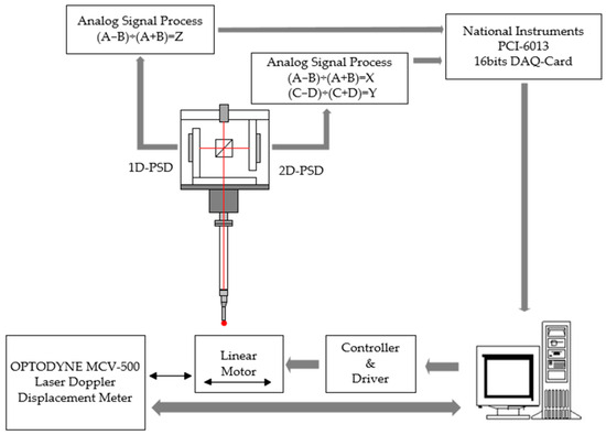 After validating the finite element analysis and verifying that the sensor configuration met the design requirements using ANSYS 2024 R1 software, the key experimental objective was to evaluate the repeatability, which is crucial for precision in probe measurements. The experiment assessed measurement uncertainty, where a lower value indicates higher accuracy. The experimental setup is illustrated in Figure 9. A linear motor, acting as the drive shaft, was used to move the stylus tip horizontally. The displacement of the ball at the tip was measured using a Doppler laser interferometer (Model MCV-500), which provides a resolution of 0.1 nm and is equipped with pressure and temperature compensation to minimize measurement errors. As illustrated in Figure 9, the voltage output was conditioned using an amplifier followed by a signal processing circuit, then digitized using the PCI-6013 data acquisition interface from National Instruments. The data were read and recorded by a computer, which acted as the central unit for the entire measurement system. Initially, the linear motor platform was positioned appropriately, then advanced 10 µm to observe the simultaneous output signals of the probe’s X, Y, and Z axes. When the platform reached the designated position, it triggered the A/D conversion and repeated the measurement. The displacements recorded through this process are listed in Table 4. The results indicate that the probe achieved a unidirectional repeatability of 0.18 µm. Sources of measurement error were the plastic deformation of the leaf spring, the motor’s movement speed, and environmental factors such as temperature and vibration.