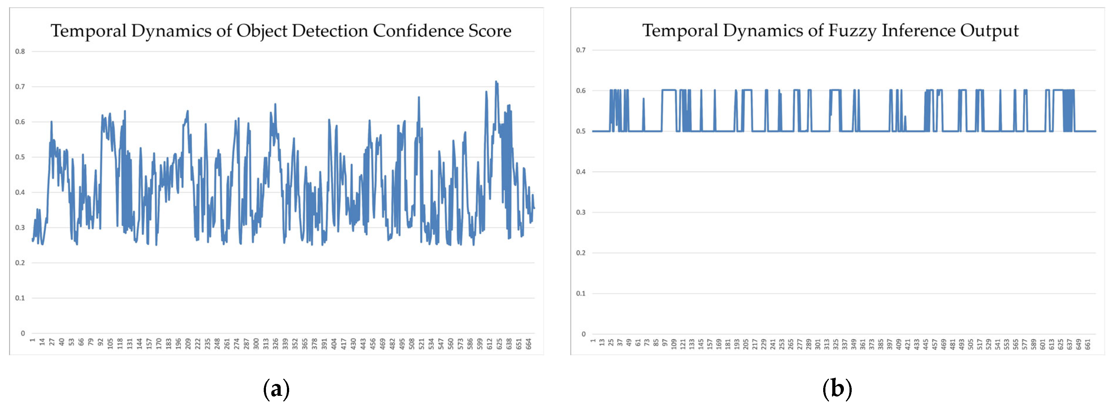Figure 3 demonstrates that relying solely on the confidence score for maritime object detection can lead to unstable or fluctuating recognition outputs, particularly under low-visibility or occluded conditions. In contrast, the proposed fuzzy inference framework that which integrates confidence score, screen ratio, and estimated distance as premise variables, produces significantly stable and semantically consistent detection outcomes. By leveraging multi-parameter fusion, the fuzzy logic system compensates for weaknesses in individual features, yielding robust DRI assessments even when one or more inputs exhibit uncertainty. This confirms the advantage of fuzzy reasoning in enhancing the reliability and interpretability of object recognition in complex maritime environments.