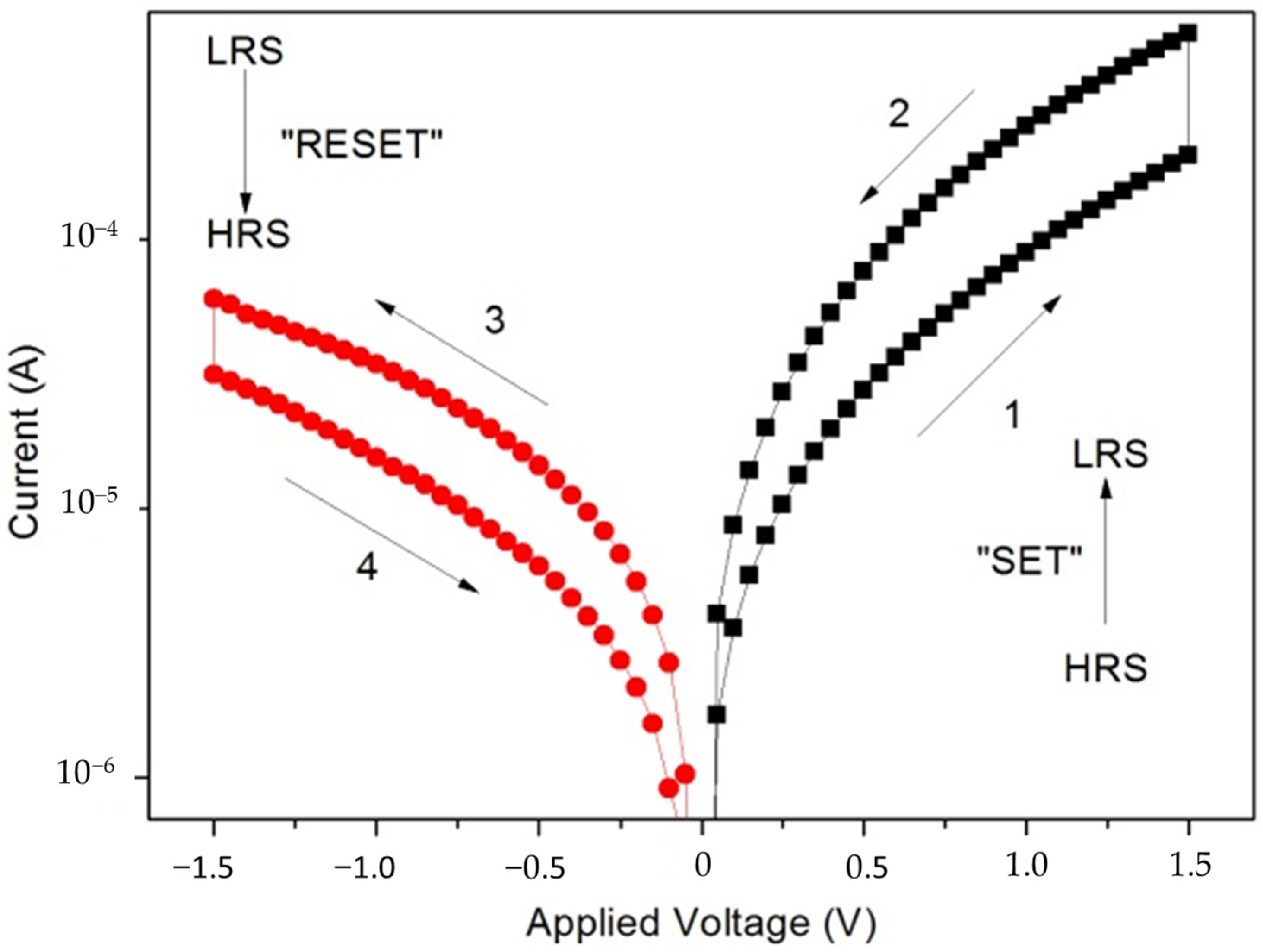 Figure 3 shows the typical I-V characteristics of the PVP-doped ZnO nanorod RRAM device measured under bipolar voltage sweeps. The device exhibits clear resistive switching behavior with a typical bipolar pattern: a “SET” process occurs under positive bias, causing the device to transition from a high-resistance state (HRS) to a low-resistance state (LRS), while a “RESET” process occurs under negative bias, causing the device to switch back from the low-resistance state to the high-resistance state. In the forward sweep (path 1), the current increases sharply around +1.0 V, indicating the formation of a conductive filament and the transition to the low-resistance state. In the reverse sweep (path 3), the device switches back to the high-resistance state at about −1.0 V, probably due to the breakage of the conductive path. At 1 V, the current ratio between the high-resistance state and the low-resistance state is about 103–104.