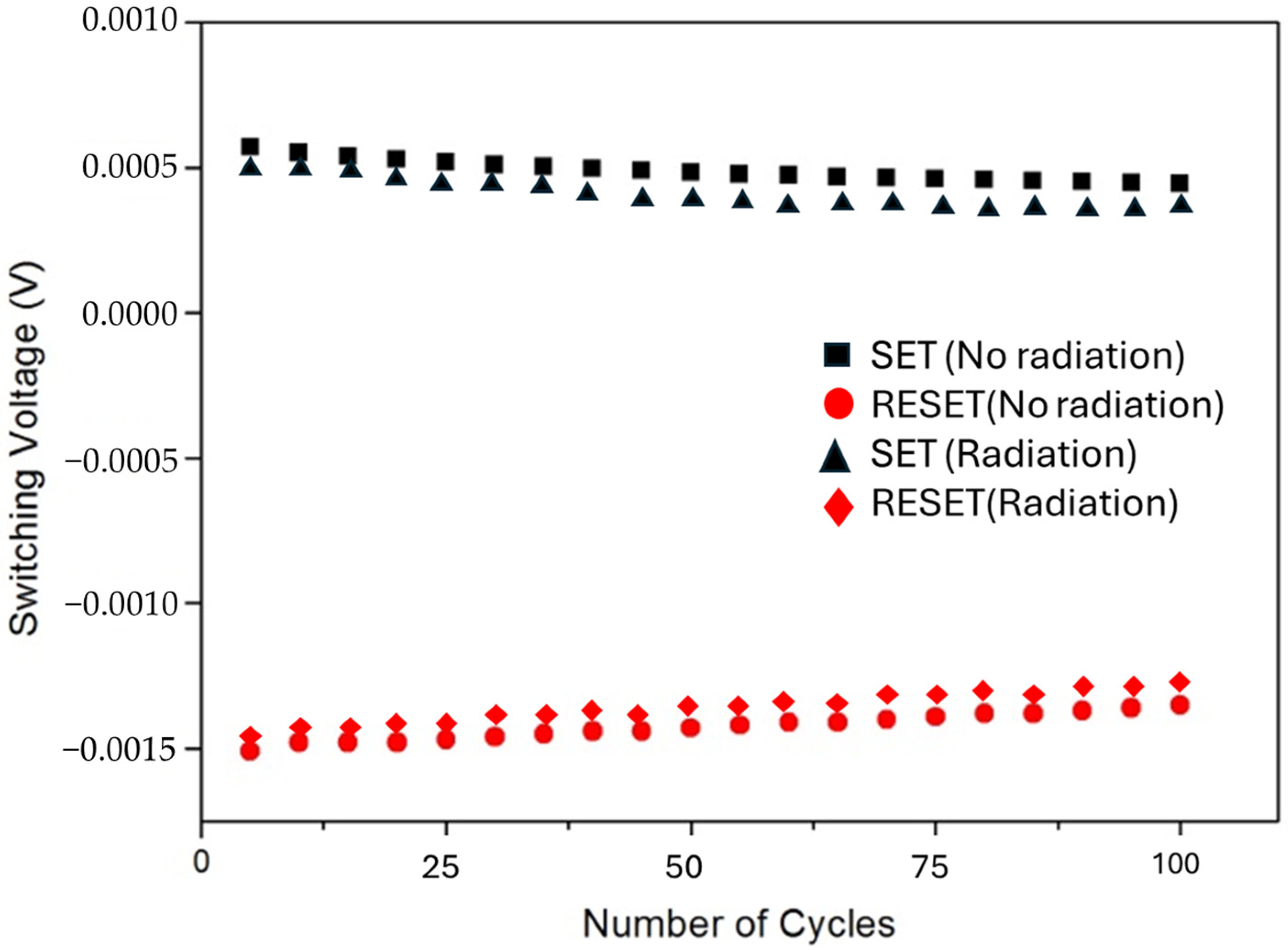 Figure 4 shows the endurance performance of the PVP-doped ZnO nanorod RRAM device under normal conditions and after gamma-ray irradiation. The SET and RESET switching voltages were recorded for 100 consecutive cycles. For the unirradiated device, the SET voltage remained stable at approximately +0.0005 V, and the RESET voltage remained stable at approximately −0.0015 V, demonstrating excellent repeatability. The irradiated device exhibited a slight downward shift in the SET voltage and a corresponding upward shift in the RESET voltage, attributed to radiation-induced defect generation and charge trapping. However, the device maintained stable bipolar switching behavior with negligible performance degradation, confirming that the polymer–oxide hybrid structure enhances the device’s radiation resistance and cycling endurance, thereby supporting reliable RRAM applications in harsh environments.