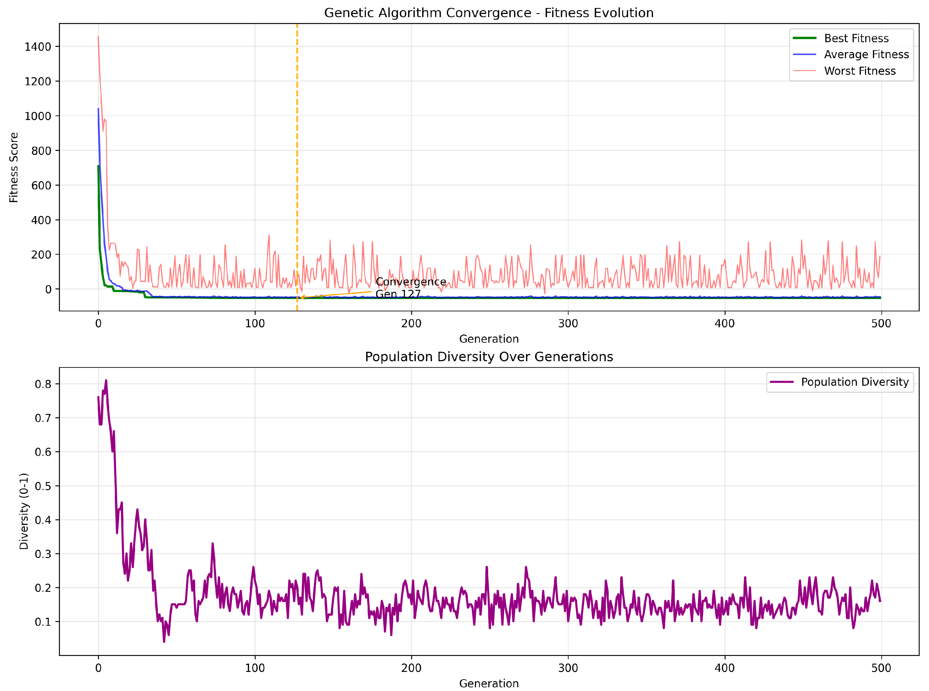 Figure 3, the top plot illustrates the convergence behavior of the GA in terms of fitness scores across generations, showing rapid improvement within the first 50 generations and convergence at generation 120–150. The bottom plot shows population diversity declining as the algorithm converges, with a final diversity score of 0.160, indicating the effective exploitation of the search space after sufficient exploration. This early, steep descent indicates a well-structured optimization landscape and shows that the evolutionary operators designed in this study can efficiently exploit directional cues in the search space.