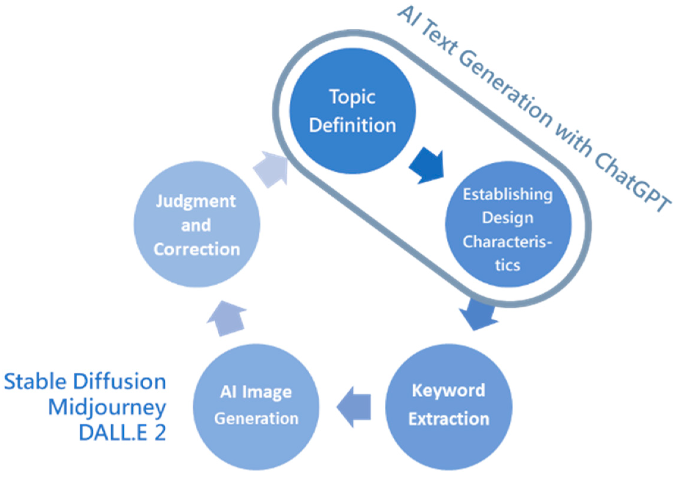 Figure 1, the workflow is visually distinguished by color: the dark blue nodes represent the text generation phase, where ChatGPT is used to analyze design topics and suggest professional characteristics. The light blue nodes indicate the subsequent image generation and evaluation phase, involving keyword refinement, visual output generation, and final design judgment.