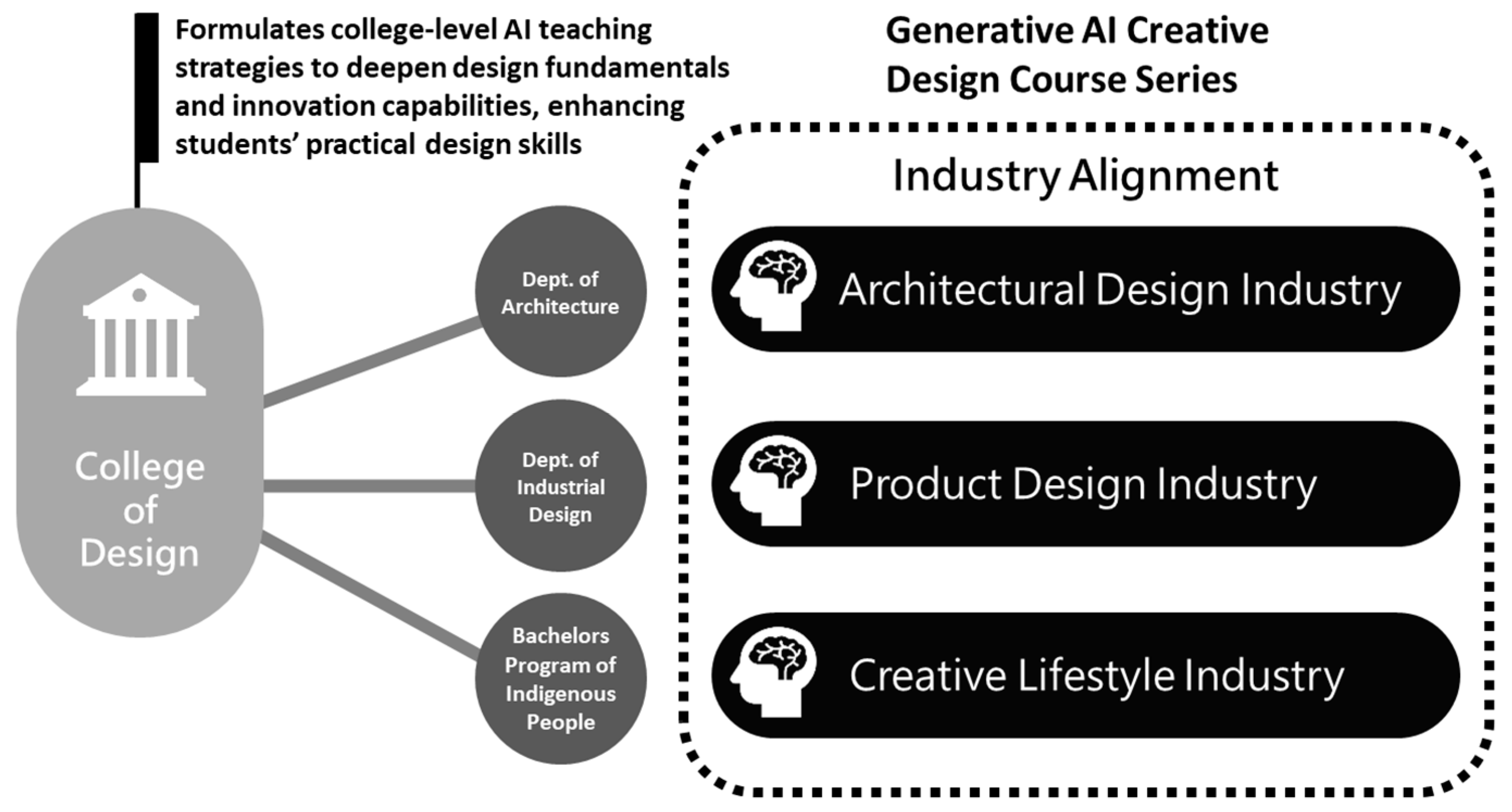 The talent cultivation needs to respond to the future needs of the creative technology service industry. According to the Ministry of Culture’s definition, the College’s AI education planning aligns with the Departments of Architecture and Industrial Design, and the Bachelor’s Program of Indigenous People (Culture and Creativity), addressing the sectors shown in