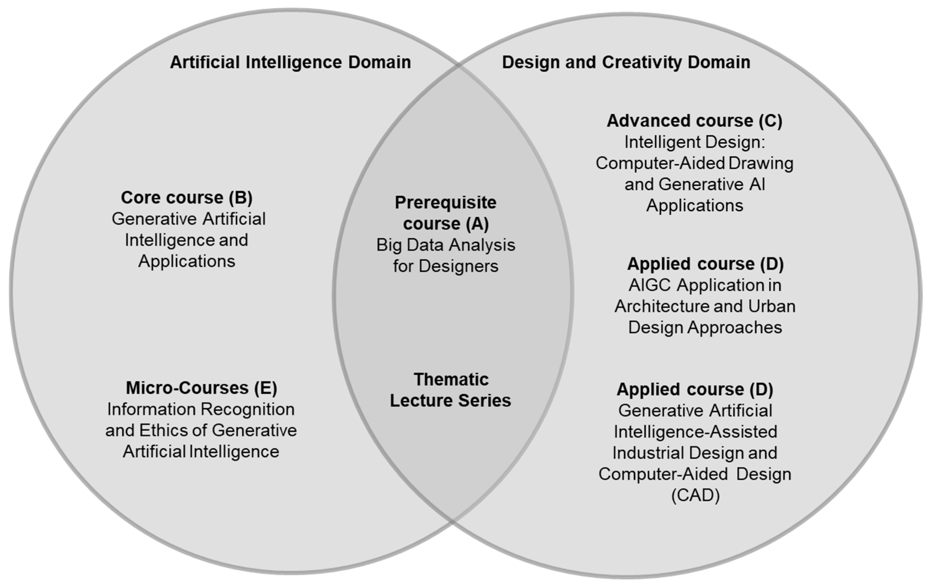 The college has launched the course series “AI-Driven Design Revolution: Integrating GAI in Creative Education” to establish a comprehensive AI teaching strategy. This initiative aims to strengthen foundational and innovative capabilities in AI-assisted design and enhance students’ practical design skills. The curriculum comprises two domains: AI and creative design, ensuring that students develop basic skills, core understanding, advanced knowledge, and applied competencies through a well-structured learning pathway. The curriculum includes prerequisite courses (A), core courses (B), advanced courses (C), and applied courses (D). It also offers micro-courses (E) and a series of lectures (