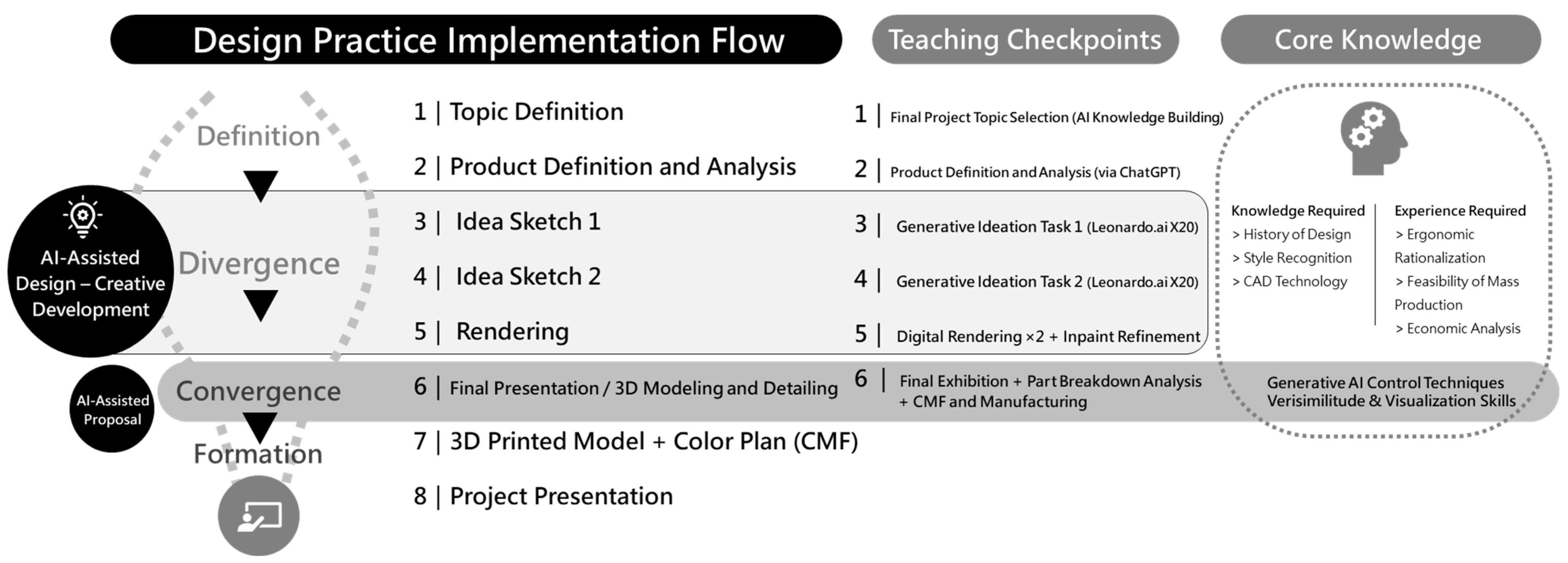 Convergence phase (refinement and production): Students integrate projects, build models, and prepare for final presentations, incorporating color, material, finish (CMF) thinking, and part segmentation logic to convert AI-generated content into feasible, tangible design outcomes.
