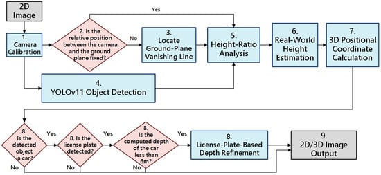- Height ratio analysis: For each detected object on the ground plane, obtain its image height and use the vanishing line from Step 3 to compute the object’s real-world height ratio [11].