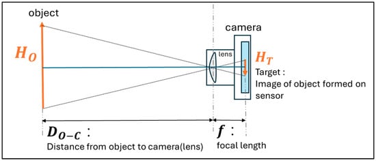 - 3D positional coordinate calculation: As shown in Figure 3, given the camera focal length f, the object’s image height , and its real height , the object-to-camera distance follows by similar triangles: