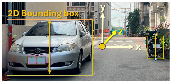 - License-plate-based depth refinement: As illustrated in Figure 4a,b, in close-range scenes, perspective distortion causes the car bounding box (green box) to include both the roof and the hood, resulting in an observed height (green arrow) that is greater than the ideal height (red arrow), which represents the true vertical span from the roof to the ground in the image. Using this overestimated height to compute depth yields an inaccurate result, often placing somewhere between the front bumper and the actual center of the vehicle . To resolve this, we detect the license plate (yellow box) within the car’s 2D bounding box; if successful, we take the license plate box height as the new image-space reference height , and use the standard physical height of a license plate ( = 16 cm in Taiwan) to recompute depth using a similarity triangle formulation. This yields a refined depth estimate , which reflects the minimum distance from the vehicle to the camera, and replaces the original depth value to improve 3D localization accuracy in close-range scenes.