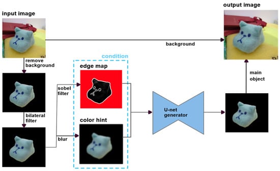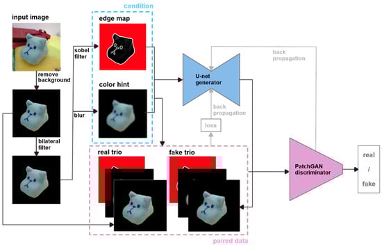 In the data preprocessing stage, input images are first subjected to background removal and bilateral filtering to reduce noise and texture interference. The preprocessed images are then transformed into two separate inputs: an edge map and a color hint image. These are paired with the original (unfiltered) image as the target output to form the training dataset.