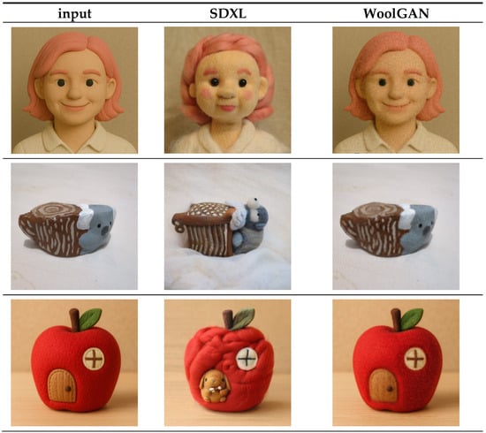 Interview feedback revealed that most participants found WoolGAN’s results visually similar to wool felt dolls. However, those unfamiliar with the material had more difficulty identifying the stylization. SDXL was frequently noted for producing fluffier textures, which aligned better with participants’ mental image of wool felt and contributed to its higher realism scores.