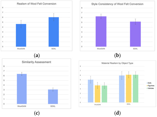 Results of subjective evaluation across four assessment categories: (a) realism of wool felt conversion: WoolGAN (mean = 4.65, variance = 1.80) vs. SDXL (mean = 6.04, variance = 1.19); (b) style consistency of wool felt conversion: WoolGAN (mean = 6.39, variance = 0.84) vs. SDXL (mean = 3.09, variance = 1.62); (c) similarity assessment: WoolGAN (mean = 6.26, variance = 1.18) vs. SDXL (mean = 5.17, variance = 1.77); and (d) material realism by object type: WoolGAN—dolls (mean = 5.04, variance = 1.89), figurines (mean = 3.78, variance = 1.68), vehicles (mean = 3.74, variance = 1.57); SDXL—dolls (mean = 5.96, variance = 1.11), figurines (mean = 6.13, variance = 1.58), vehicles (mean = 6.13, variance = 1.22). Error bars represent 95% confidence intervals.
