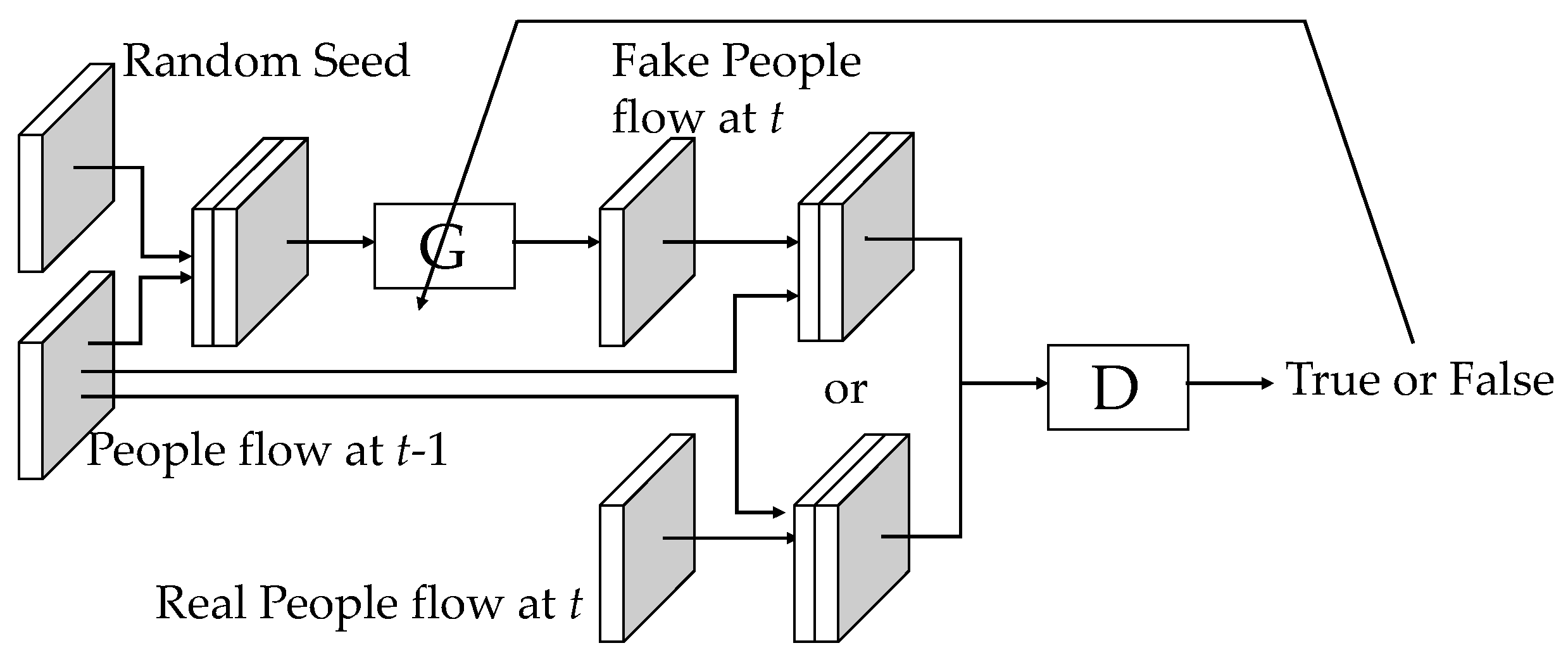 This generator accepts a tensor of shape 3 × 3 × 2 (comprising the actual flow of individuals at the previous moment and random noise of identical dimensions) as input. Initially, a 1 × 1 convolutional layer with 8 channels and padding set to the same is employed to facilitate cross-channel feature fusion without altering the spatial dimensions. This is followed by Batch Normalization and a tanh activation function to constrain the output within the range [−1,1]. Subsequently, the features are flattened into vectors, and two fully connected layers with 32 and 16 hidden units, respectively, each accompanied by Batch Normalization and tanh activation, are utilized to enable interaction and compression of global information. The final fully connected layer outputs a 9-dimensional vector, which is reshaped into a 3 × 3 × 1 prediction matrix.