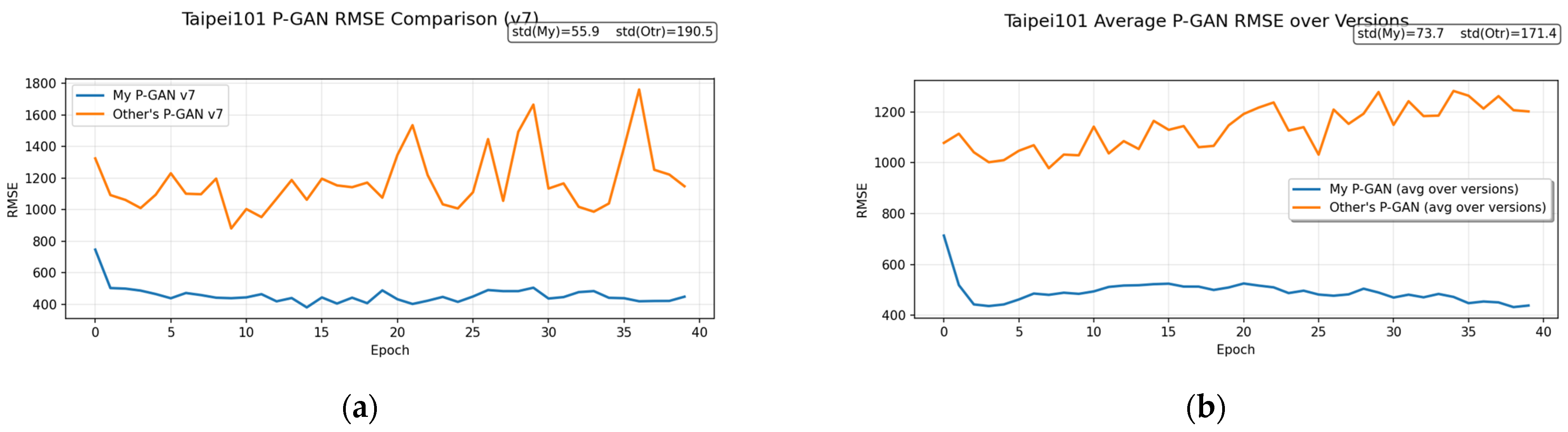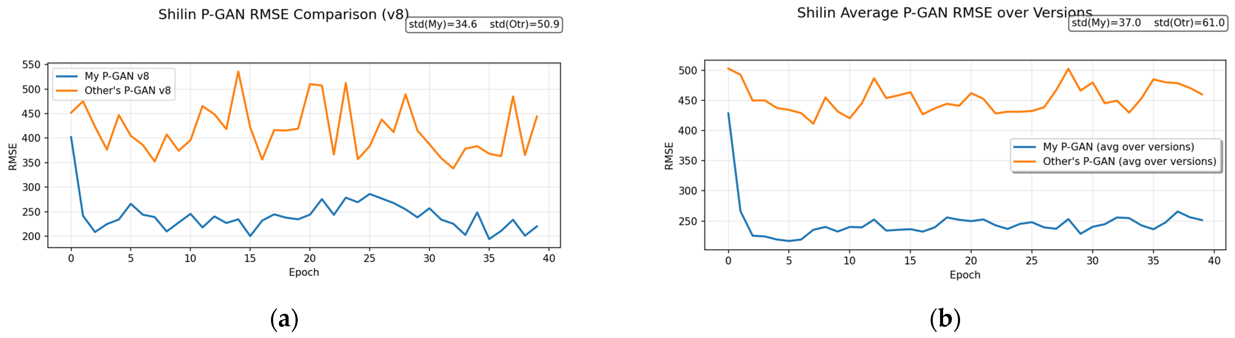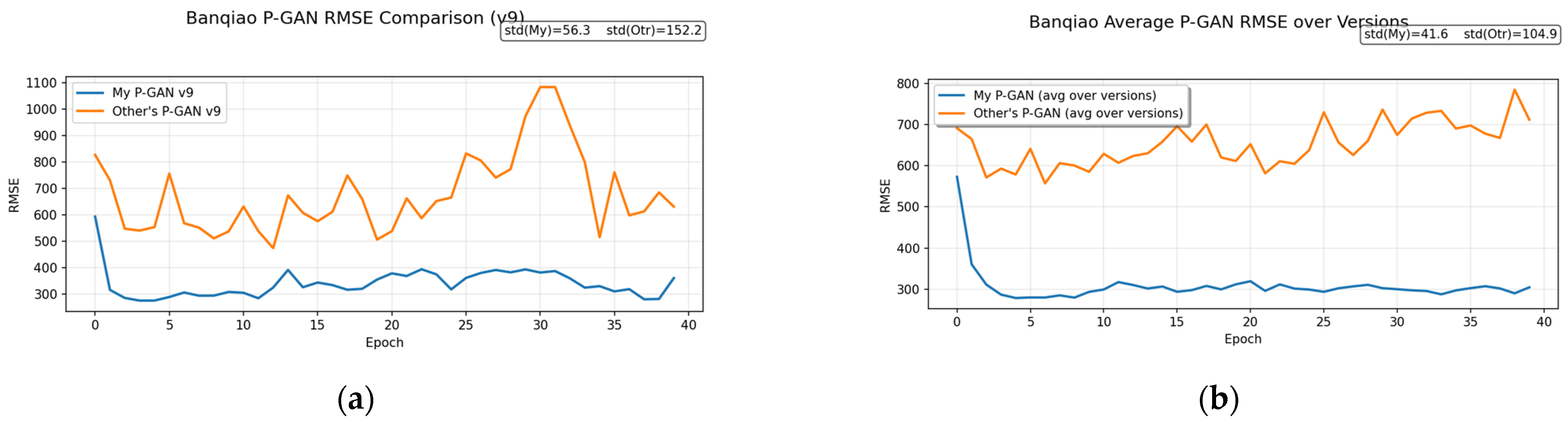 Figure 4b shows the average RMSE curves of the developed GAN model and the control model for 10 versions at different training epochs in the Shilin area. The average RMSE falls between about 210–270, while the control model is mostly concentrated between 420 and 500, indicating that the GAN proposed in this study can maintain significantly lower prediction errors under various settings. From the convergence behavior, the developed model dropped and stabilized in the first 5 epochs. In contrast, the control model requires a longer training time to see a significant performance improvement, indicating that the architecture of the developed model has a faster convergence speed. In addition, the RMSE of the developed model fluctuated less between the ten versions (an SD of 37.0), which is much smaller than 61.0 of the control group. This result shows that even if the average of the ten versions is taken, this method shows a consistently excellent trend, verifying its effectiveness.