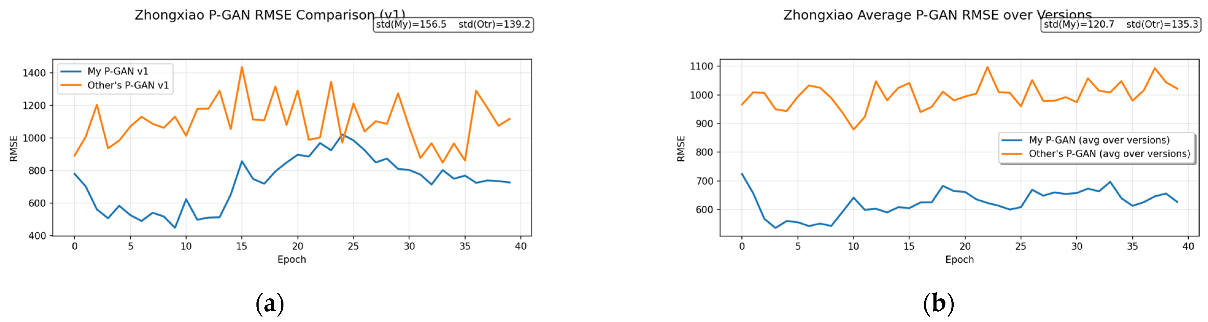 Figure 7b presents the average RMSE across ten independently initialized variants of the GAN and its control group counterpart within the Zhongxiao Business District, plotted against the number of training iterations. The results corroborate the findings in