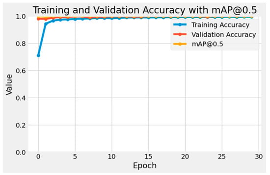 Figure 2 shows the curves of training accuracy and validation accuracy of the CNN model during the training process. The training accuracy and validation accuracy of the model increase rapidly and reach a stable level after several rounds of training. At the same time, the value of mAP@0.5 also continues to increase to close to 1.0. This means that the CNN model has good learning and generalization capability, without the over-fitting problem [7].