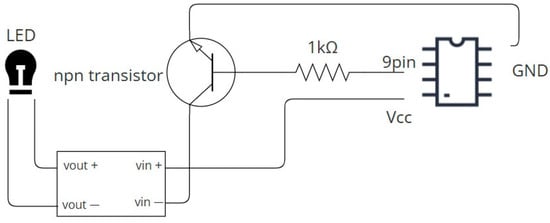 Figure 5 shows the circuit diagram of the experimental device. We used the pin 9 corner of the Arduino to connect the base of the NPN transistor, so that we could control the switch of the NPN transistor to make the LED flash. Then, the VCC of the Arduino was connected to the vin+ of the boost module, and then the vout+ was connected to the positive of the LED. The LED was connected back to the vout− of the boost module, and then vin− was connected to the collector of the transistor, and finally the emitter of the npn transistor was connected to the GND of the Arduino.