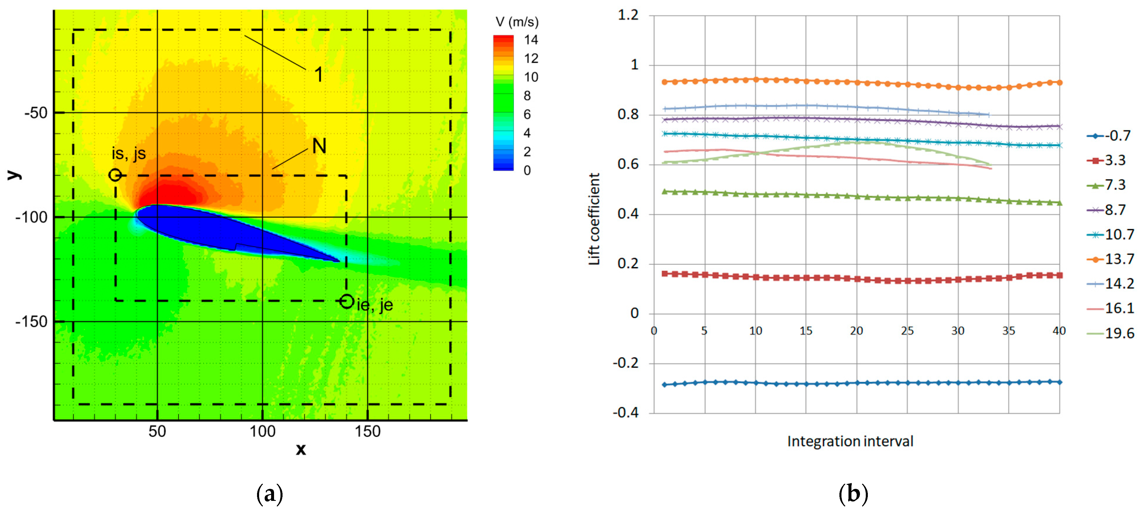 - Olasek, K.; Karczewski, M. Velocity Data-Based Determination of Airfoil Characteristics with Circulation and Fluid Momentum Change Methods, Including a Control Surface Size Independence Test. Exp. Fluids 2021, 62, 108. [Google Scholar] [CrossRef]