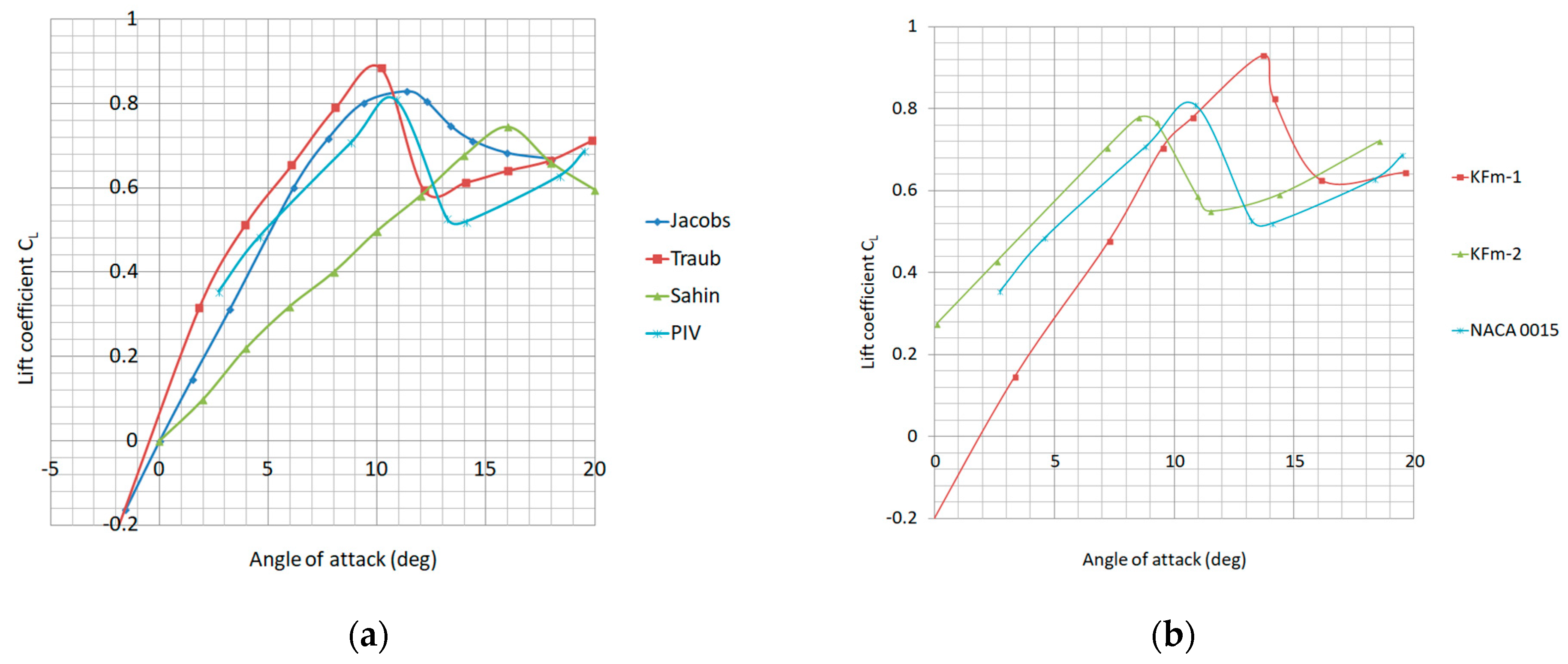 - Winslow, J.; Otsuka, H.; Govindarajan, B.; Chopra, I. Basic Understanding of Airfoil Characteristics at Low Reynolds Numbers (104–105). J. Aircr. 2018, 55, 1050–1061. [Google Scholar] [CrossRef]
