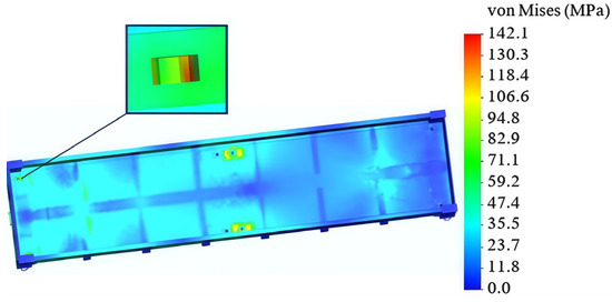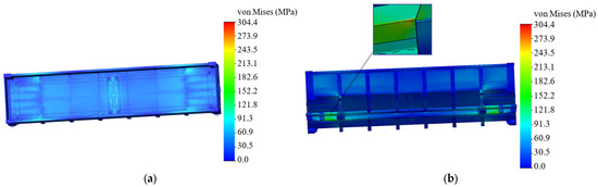The acceleration determined by the mathematical model was considered when calculating the strength of the open wagon body. The results of the calculations are shown in Figure 13 and Figure 14. The maximum stresses in the body were identified in the zone of interaction of the backbone beam with the pivot beam. These stresses amounted to 304.4 MPa (Figure 13), which is lower by 2% than the permissible ones. The stresses that arise in the zone of interaction of the open wagon body floor amounted to about 165 MPa.