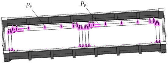 The design scheme of the open wagon is shown in Figure 11. It considers the vertical load Pv, which is distributed over the area of contact of the removable module with the open wagon floor, as well as the longitudinal load Pp, which acts on the plates of the fitting stops. A longitudinal force of 3.5 MN was applied to the rear stop of the automatic coupler of the open wagon (it is not shown in Figure 11). This force was balanced by the inertia forces of the wagon mass on the opposite side of the body.