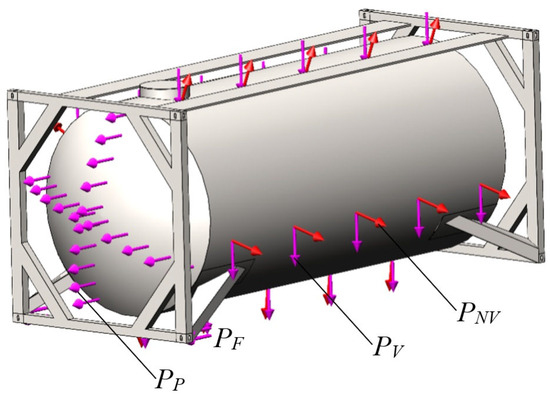 The calculation was carried out using an example of a tank container of the standard size 1CC and model TK25. Based on this model, a finite element model was formed using tetrahedra [34, 35, 36, 37, 38]. The model includes 172,114 elements with a maximum size of 120 mm and a minimum size of 24 mm (Figure 15). The number of nodes in the model was 56,913. At the next stage of the study, a calculation scheme of a tank container was created (Figure 16). It was considered that the tank container is subjected to the vertical load PV [N] due to the gross weight, the load due to pressure from the bulk cargo on the boiler PNV [N], the longitudinal force PP [N] from the bulk cargo on the bottom of the boiler, and finally the forces PF [N] acting on the fittings.