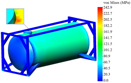 The tank container was secured to the fittings using a rigid connection. It was found that, considering the calculations, the maximum stress occurs in the area of the hatch, and it has a value of 242.9 MPa (Figure 17). The resulting stress does not exceed the permissible value, which is assumed to be 310.5 MPa [26].