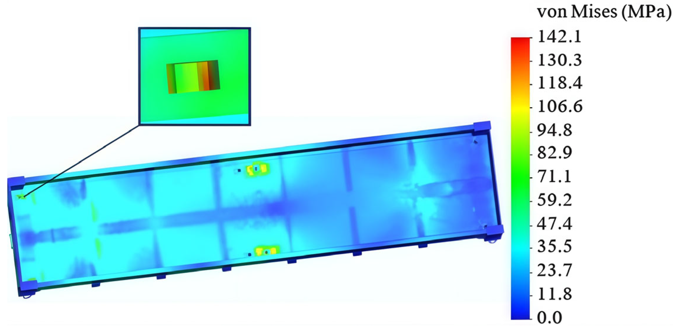- The strength indicators of the tank container during transportation on an open wagon were determined. The results of the calculations showed that the maximum stress occurs in the area of the hatch of the tank container boiler and is 242.9 MPa. It should be noted that the stress value obtained is lower than the permissible one by 21.8%. Thus, the strength of the tank container, considering the proposed fastening scheme on an open wagon, is ensured. The maximum displacements were indicated at the end part of the boiler and amounted to the value of 1.45 mm.