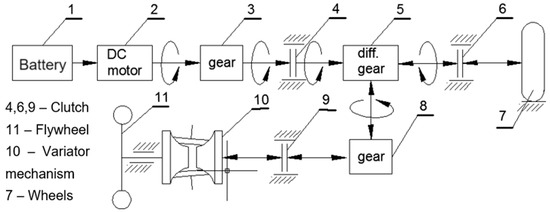 Figure 1 shows the structural diagram of the considered hybrid city electric vehicle with a kinetic energy storage system (KERS). The block diagram for controlling the different modes of motion of the transport vehicle in the conditions of a big city is presented in Figure 2.
