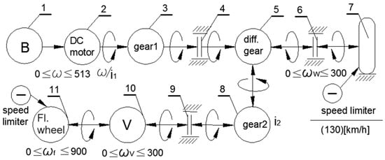 The flow of the energy direction is in the sequence 1-2-3-4-5-6-7 (Figure 2), with couplings 4 and 6 switched on and coupling 10 switched off. The differential equation of motion for the driving wheels takes the following form: