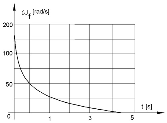 The solutions of Equation (8) for this case are presented in Figure 9 for iV(t) and for angular velocity of the flywheel ωf(t), and in Figure 10 for ωf(t) as functions of time.