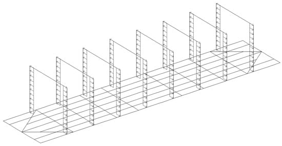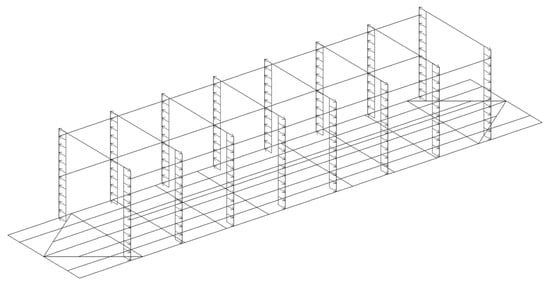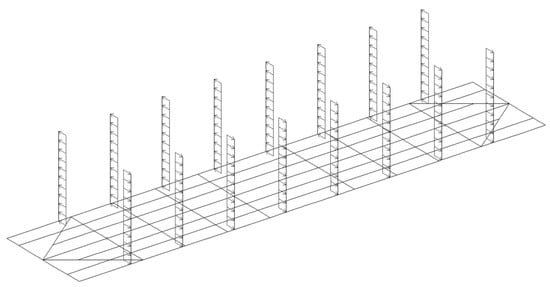 The most rational variant of the superstructure and the stanchion thickness were determined through the calculation of the load-bearing structure of the flat wagon. The purpose of this calculation was to determine the internal force factors acting in the superstructures under external loads. The load-bearing structure of the flat wagon was modeled as a rod system (Figure 2) in LIRA-CAD [15,16,17,18]. It was also taken into account that the structure was loaded with gross weight, and the stanchions were subjected to transverse load. The intensity of this load included the transverse inertial force ΔFn from the stack and was distributed along the stanchion height [7]: