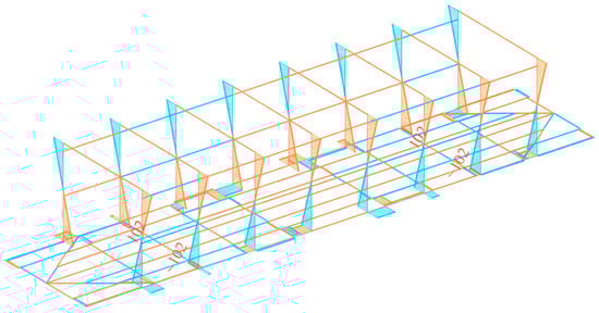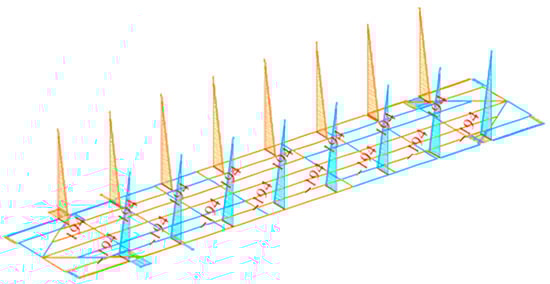 The diagram of bending moments is a parabola with its maximum in the middle (Figure 7). On the side where the stanchions are loaded, the bending moment is 55.3 kN·m; on the opposite side, the numerical value of the bending moment is negative.