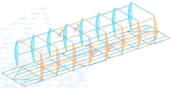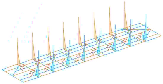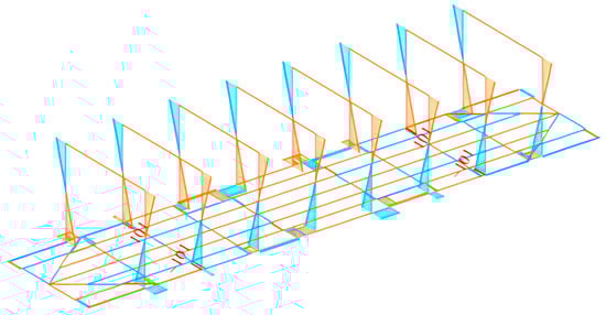 Taking into account the results of the calculations, diagrams of the force factors acting in the load-bearing structure of the flat wagon were obtained (Figure 3 and Figure 4). Consequently, the maximum transverse force acts at the stanchion base and amounts to 194 kN (Figure 3). The bending moments had a similar distribution pattern (Figure 4). The maximum bending moment is also at the stanchion base and amounts to 224 kN m. These force factors have an alternating character: stretching is shown in orange and compression is shown in blue (Figure 3 and Figure 4).