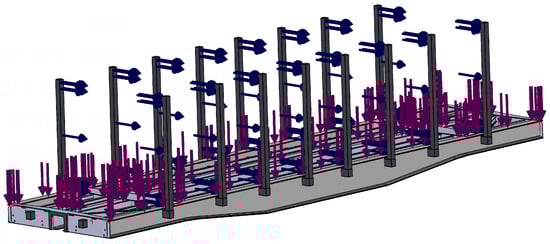 The selected parameters of the stanchion were checked by means of the strength calculation of the load-bearing structure of the upgraded flat wagon using the finite element method [20,21,22,23] implemented in SolidWorks simulation. The design diagram of the load-bearing structure of the flat wagon is shown in Figure 14.