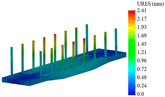 The maximum displacements occurred in the upper parts of the vertical stanchions placed behind the center of the longitudinal beam. These displacements were 2.4 mm (Figure 16).