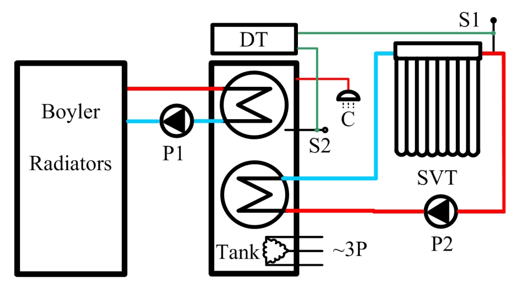 Figure 1. Water circulation is provided by pumps P1 and P2. The biofuel boiler has a capacity of 15 kW. The storage tank has a volume of 300 L and contains two coils forming two independent water-circulation loops. Because the solar panel is integrated year-round, it is possible under certain conditions during the spring and autumn transitional periods for both the boiler and the solar panel to operate simultaneously.