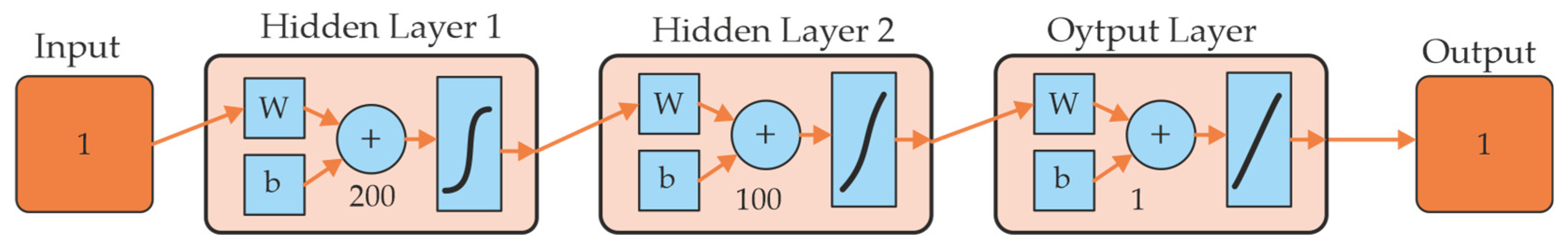 In this study, the hidden layers use the hyperbolic tangent (tansig) and the logistic sigmoid (logsig) activation functions, respectively, which are standard in MATLAB’s Neural Network Toolbox for nonlinear regression using the Levenberg–Marquardt training algorithm. These functions provide smooth nonlinear mappings and stable gradients, ensuring reliable convergence during training.