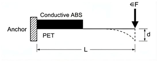 The proposed airflow sensor employs a cantilever beam mechanism as shown in Figure 1, chosen for its ability to maximize deflection and strain under applied force—an essential requirement for piezoresistive sensing. The airflow-induced dynamic pressure is directed perpendicularly onto the beam’s free end surface, generating measurable strain at the fixed support where the sensing element is printed for maximum sensitivity. The tip deflection δ of the cantilever under an external force F is expressed as: