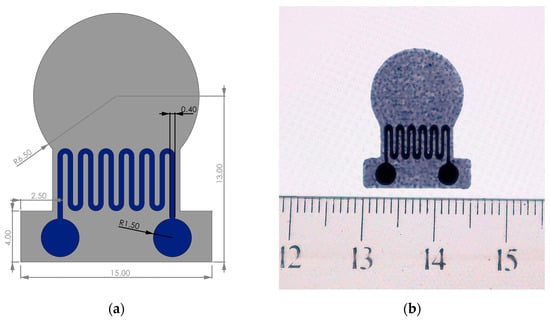 The piezoresistive layer uses a low-cost, Frosch ABS-based conductive filament [14]. This material choice is pivotal, as its ease of application and zero required curing time circumvent the need for time-consuming conventional microfabrication processes. The piezoresistive layer is strategically placed near the fixed support of the cantilever—the zone where the theoretical strain ϵ is maximized as shown in Figure 2a. This placement ensures that even minor deformations caused by the airflow are efficiently converted into the largest possible change in electrical resistance. A summary of the materials and parameters is presented in Table 1.