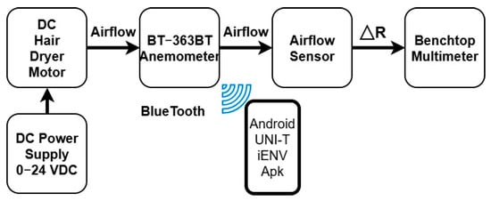 The proposed piezoresistive airflow sensor was characterized using a purpose-built testbed designed for accurate correlation between airflow velocity and resistance response. The airflow source was provided by a repurposed direct current (DC) fan motor (salvaged from a hair dryer), with velocity controlled via the input voltage Vmotor supplied by a GW Instek GPC-3303A DC power supply (Good Will Instrument Co., Ltd., New Taipei City, Taiwan).