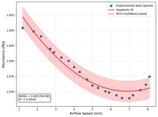 Measurements were taken across the fan’s operational range, corresponding to flow velocities between 0.5 m/s and 15.0 m/s. Each reported point represents the average of multiple steady-state readings to minimize noise. Experimental results confirmed the theoretical prediction from Section 3: since dynamic pressure is proportional to v2, the resulting force and strain also scale quadratically with airflow velocity, as shown in Figure 6. Accordingly, the measured resistance response was best fit by a second-order polynomial: