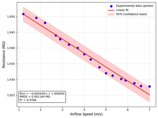 where Rsensor is resistance in Ω, and v is velocity in m/s. The fitted coefficients were: = 1.9657, = −1.031 × 10−2, = 7.46 × 104. The polynomial model achieved an excellent fit, with RMSE = 1.709 kΩ. A practical quasi-linear region in Figure 6 was also identified between 1.2 m/s and 7 m/s, where the sensor response can be approximated by a first-order model:
