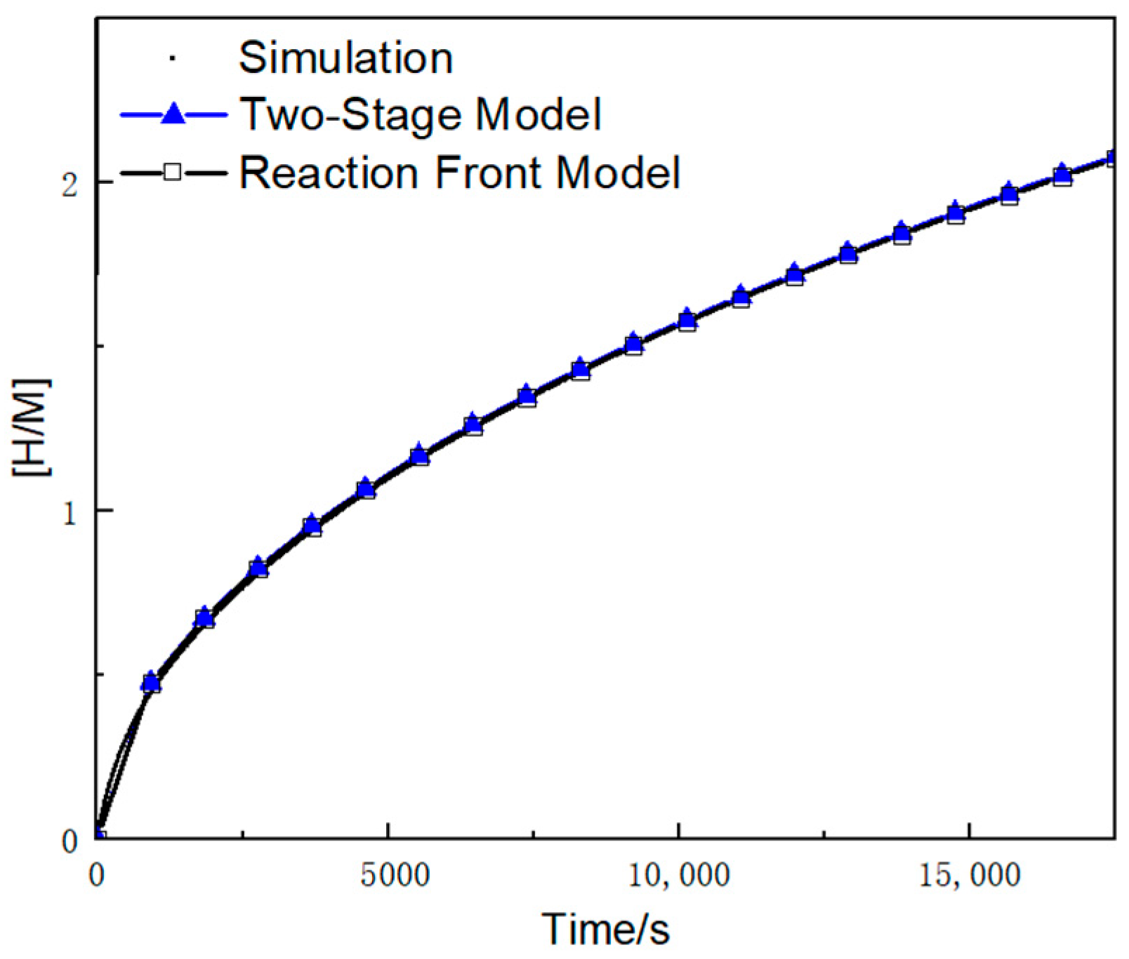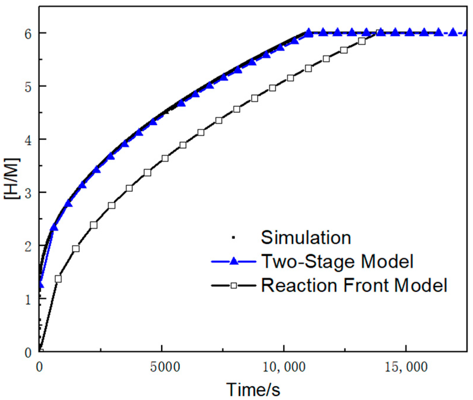 - Based on the assumptions of neglecting the first-stage reaction time and maintaining bed thermal equilibrium, a novel two-stage theoretical model was developed. This model successfully characterizes the internal hydrogen–thermal coupling and reaction progress. Having been numerically validated, the new model achieves a prediction accuracy of 2% for reaction rates, significantly outperforming the original reaction front model’s 25.5% error margin.