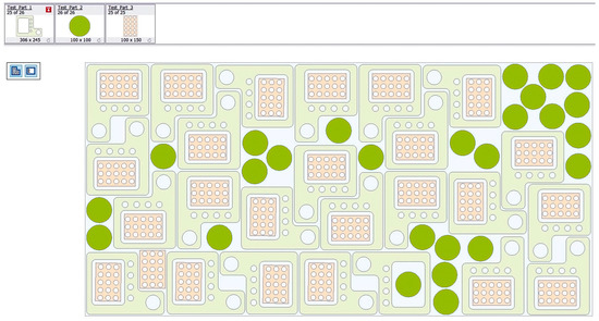 Although this approach is acceptable for simple geometries or small production runs, it inevitably leads to larger “islands” of unused material and a less compact packing of the parts. In contrast, the automatic nesting shown in Figure 3 is generated by the CAD/CAM system using an internal optimization algorithm that explores many feasible placements and orientations. The resulting layout is visibly denser, with reduced gaps and improved contour adjacency, which directly contributes to the higher material utilization, the increased number of parts per sheet, and the shorter cutting path reported in the quantitative section. Thus, Figure 2 and Figure 3 provide a visual explanation of the numerical results: the algorithmic search performed by the nesting module systematically outperforms the operator’s intuitive arrangement, especially as the geometry becomes more complex or the batch size grows.