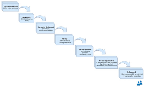 Figure 4 presents a block diagram of the complete digital workflow, from CAD modelling to the generation of NC code for the CNC laser cutting machine. The process begins with importing the CAD geometry, where the system supports multiple neutral and native formats with extensions such as .dxf/dwg, step, ensuring compatibility with different design environments. The next step is the definition of the technological context: selection of the material (e.g., stainless steel 1.4301) and thickness (10 mm), which determines the appropriate cutting speed, laser power and assist gas parameters. The nesting stage follows, where either manual or automatic placement of the parts on the sheet is performed. Afterwards, the CAM environment generates the cutting technology—lead-ins, lead-outs, pierce points, micro-joints and contour sequence—taking into account collision avoidance and thermal distortion. In the final stages, optimization routines minimize the total cutting time by refining the toolpath order and feed rates, and the system exports the corresponding NC program together with an operator report. This diagram emphasizes that the nesting task is not an isolated operation but an integral part of a fully digital CAD/CAM–CNC chain, where decisions at each stage (material selection, nesting strategy, path optimization) cumulatively affect productivity, material efficiency and overall process sustainability.