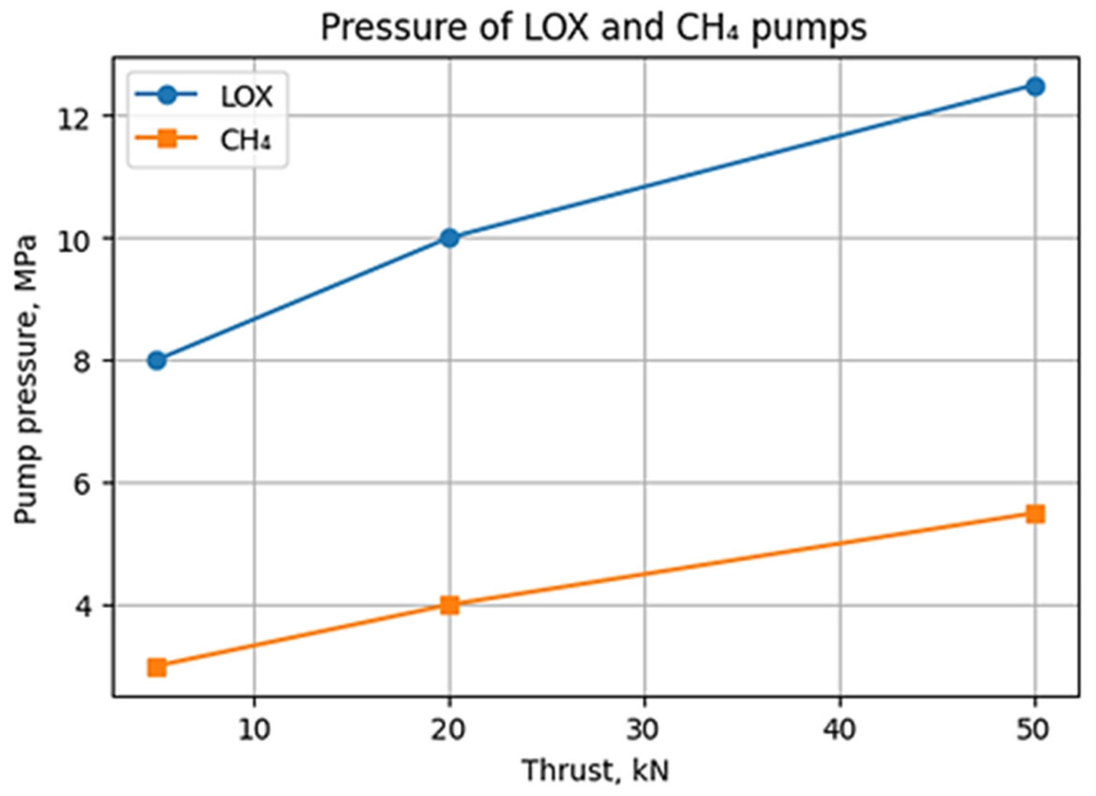 Figure 1 shows the required pump pressures. The oxidizer pump (LOX) operates in the range of 8–13 MPa, and the fuel pump (CH